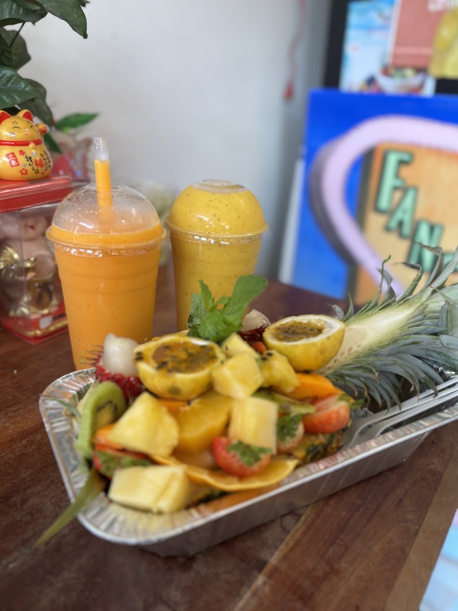 I've seen Fancy Fresh in so many Instagram reels and TikTok's recently, so I had to see what the hype was about! I got to sample a few of the drinks. I forget which one I tried, but it had a lot of greens in it and was super refreshing. Maddy was super kind and friendly. I ended up sharing the watermelon lychee, which was so refreshing and delicious! Everything was so fresh, and there were even whole pieces of lychee inside. I felt like it was a really fair price point given the high quality ingredients they use. The inside of the shop was super cute. They were selling a lot of unique fruits, which I would definitely consider buying in the future. The only downside of this place is the parking. It seemed like there was a parking lot to the side, but the stalls looked tiny and crowded. I think there's street parking, but luckily I was nearby and could just walk.