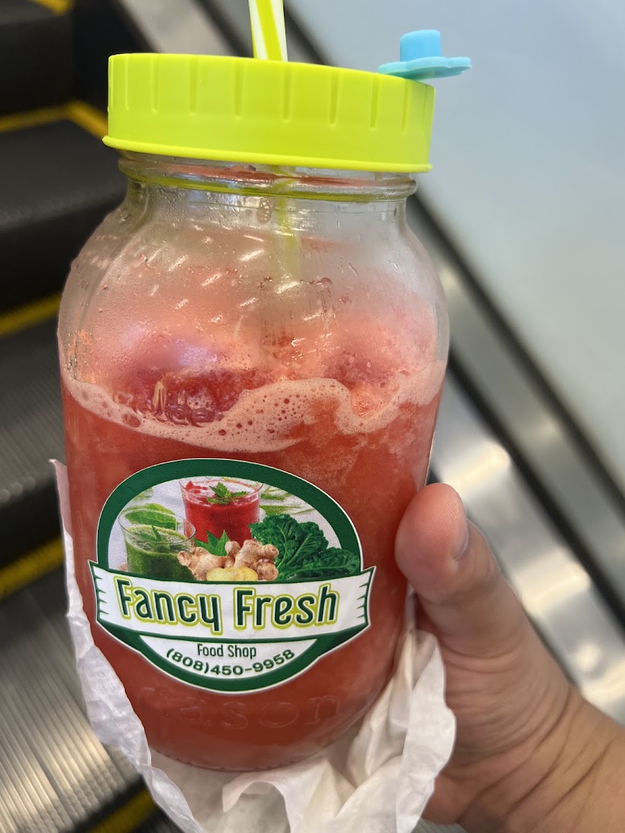 Ordered the mango strawberry kumquat smoothie, it was the perfect balance of sweet and tangy. Fancy fresh is a small shop but has so much selection when it comes to smoothies as well as their assortment of fresh fruits and refrigerated items such as kimchee or pickled ginger. The workers there are very sweet and I love that you can reuse your jar for your next visit, as well as the lids that they give you so do you can drink straight out of your glass.